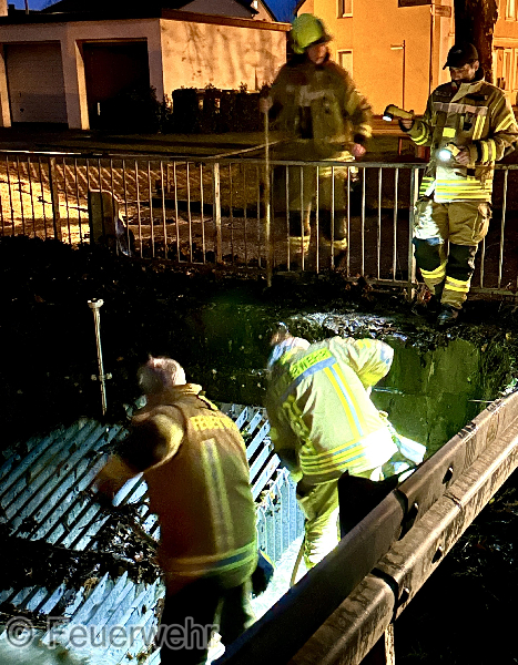 Nach den starken Regenfällen der letzten Tage führt die Steinbeke aus dem Hochwald wieder größere Mengen Wasser. Die Einlaufroste war mit Astwerk, Laub und Unrat verstopft. Die Steinbeke tritt aus dem Flussbett aus und läuft über die Straßen.