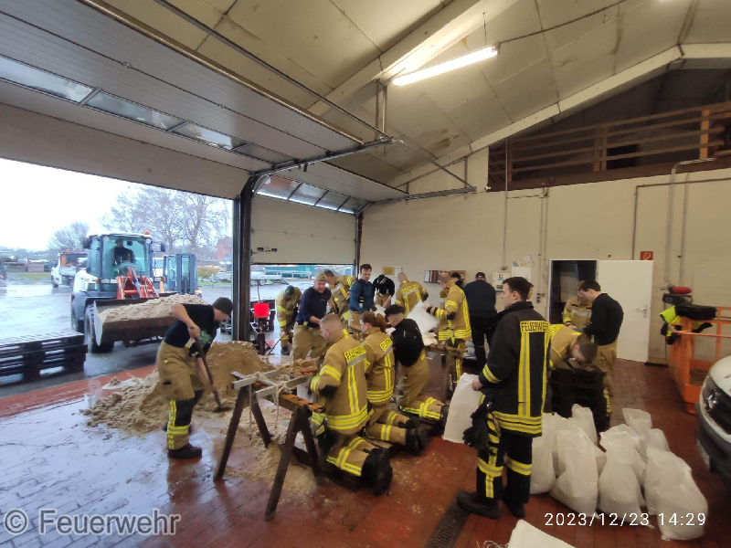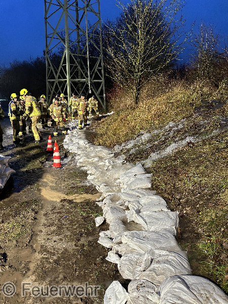 Befüllen und Verbauen der Sandsäcke am Damm der Steinbeke als Sicherungsmaßnahme
