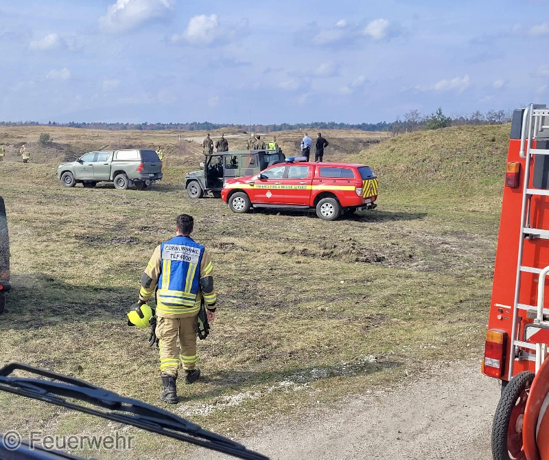 Etwa 200 qm Heide- und Grasfläche brannte an der Schießbahn, beim Eintreffen waren nur noch Nachlöscharbeiten erforderlich. Die Defence Fire Service war im Einsatz an einer anderen Schießbahn im Einsatz.