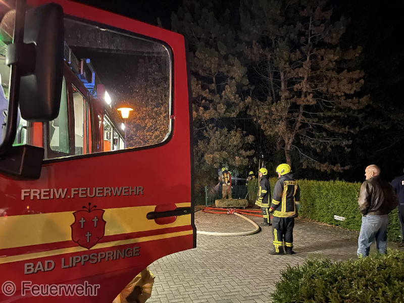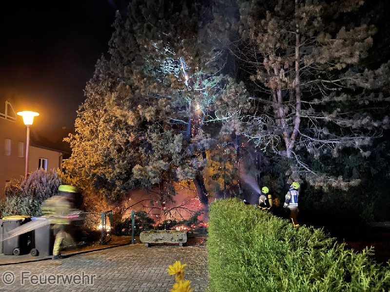 Um 19.50 Uhr wurde die Feuerwehr Bad Lippspringe zum 147.ten Einsatz in 2021 alarmiert. Beim Eintreffen des ersten Fahrzeuges war ein Baum im Garten bereits bis zum Wipfel durchgezündet. Im Bodenbereich breitete sich das Feuer auf die anderen Bäume und Heckenteile aus. Mit dem Schnellangriff und einem C-Rohr wurde das Feuer am Boden und in den Bäumen schnell gelöscht. Für einen Zugang zwischen die Bäume mussten kleinere Teile der Bäume und Büsche mit der Motorsäge herausgeschnitten werden.